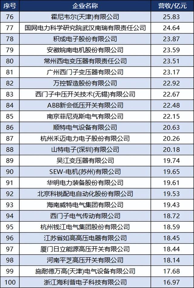 浙江海利普电子科技有限公司2023年主营业务收入16.91亿元,排名榜单第100位,与上一年相比,入围门槛提高了1.45亿元,同比增长9.3%;百强电气企业主营业务收入总额7971.89亿元,同比增长40.6%。随着新能源工业的高速发展,电气企业的发展速度越来越快,增长前景可期。