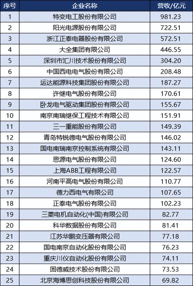根据电气时代杂志社2024年末发布的“第24届中国电气工业100强排行榜”,2023年我国有18家电气企业的主营业务收入超过了100亿元,其中有3家电气企业的主营业务收入超过了500亿元,榜首的特变电工股份有限公司2023年主营业务收入981.23亿元,距离千亿近在咫尺了;